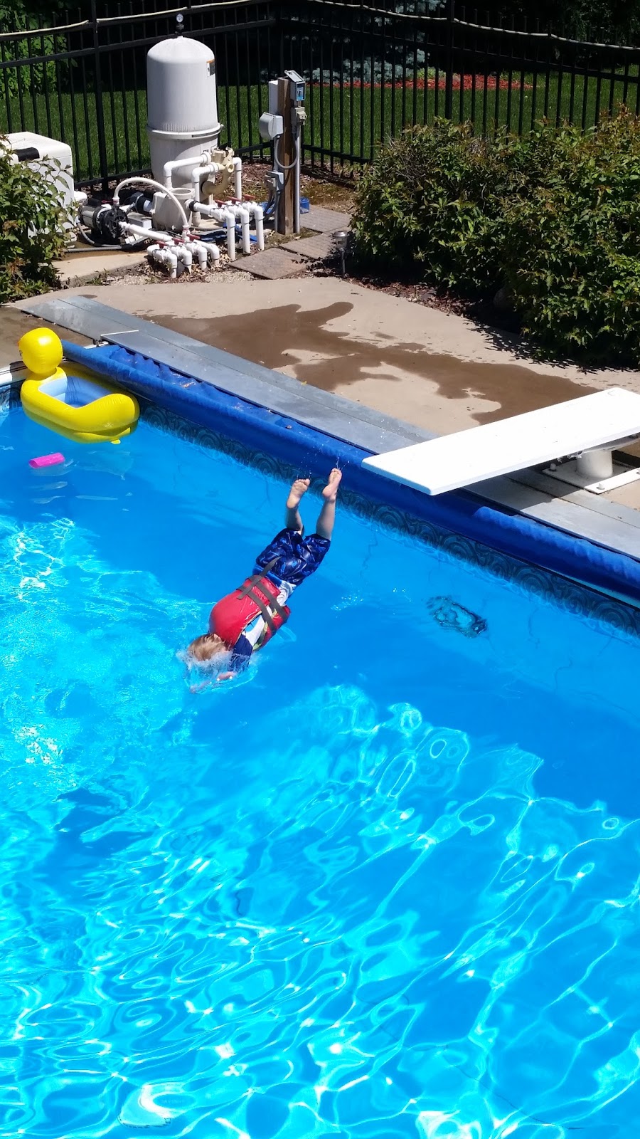 Later that day, we had more of Mommy's friends over for a pool party at Auntie Annie and Uncle Eric's house. Theo was eager to jump in and he immediately saw the white plank at the end of the pool and asked, "Mommy, is that a diving board?" Mommy said, "Yes" and he said, "My want to go off the diving board, please." He had never gone off a diving board but he had watched the "big kids" at the local pool go off and he was wearing a life jacket so Mommy said "Ok". He climbed out of the pool and ran to the end, climbed up and just jumped right off! He swam/doggy paddled over to the ladder and climbed out and did it again, and again, and again. He went off at least a dozen times before we had to go inside for dinner. He was hooked!